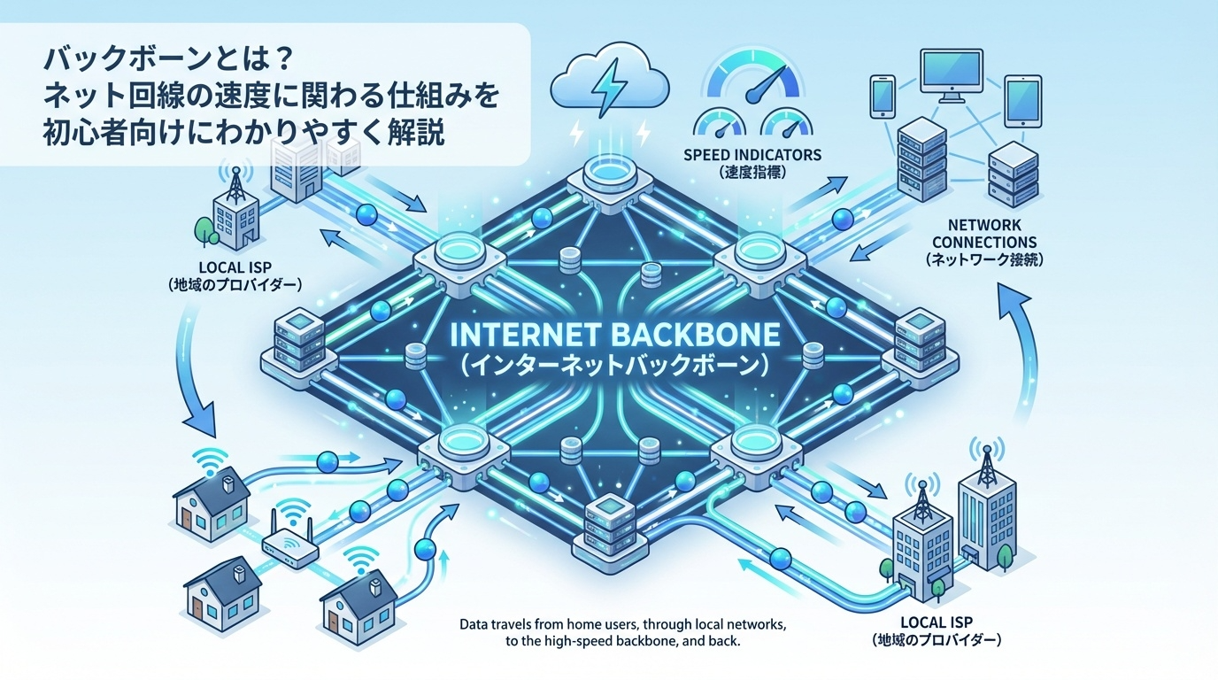 バックボーンとは、通信事業者が運用する大容量・高速の基幹ネットワークのこと。光回線(アクセスネットワーク)の上位に位置し、インターネットの「背骨」として全国・世界をつなぐ通信網です。回線速度はバックボーンだけでなく、接続方式(PPPoE/IPoE)・ISP間接続・自宅のLAN環境など複数の要素で決まります。