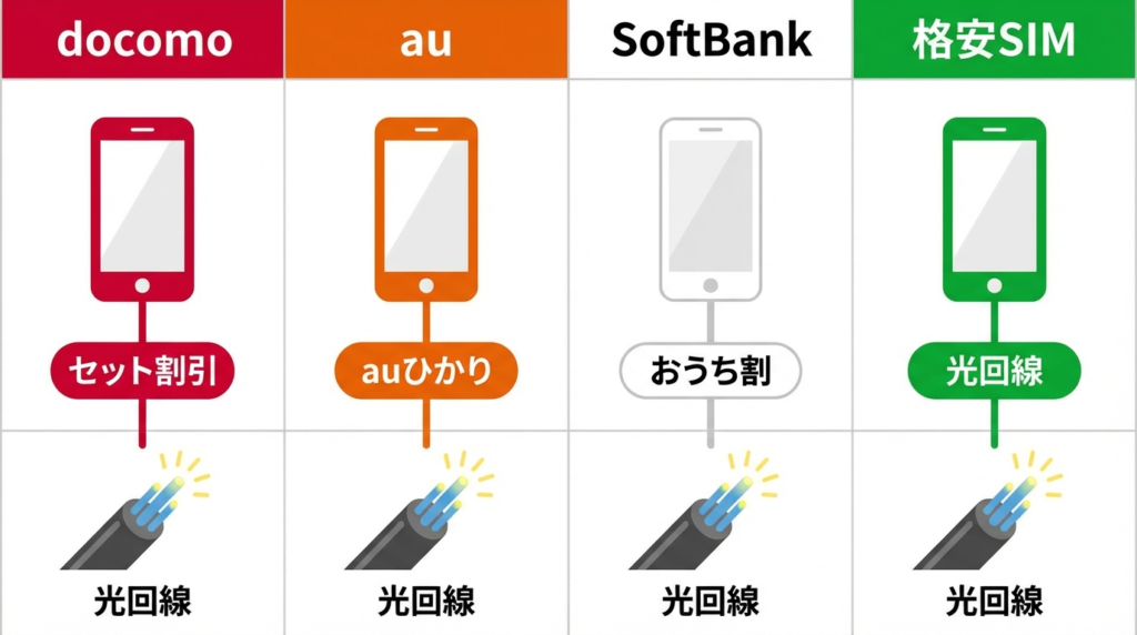 スマホキャリア別おすすめ光回線2026年版|ドコモ・au・ソフトバンク・格安SIMのセット割で最強の組み合わせを解説