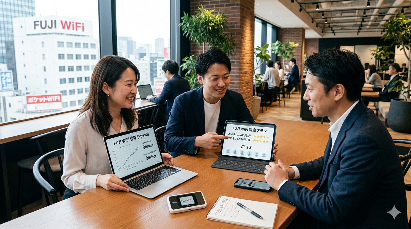 この比較表から見える傾向として、FUJI WiFiは「法人対応」と「海外利用」で差別化されていることが分かります。純粋な月額料金だけを見ると、にゃんこWi-FiやMUGEN WiFiのほうが安い水準です。