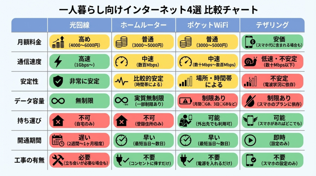 一人暮らしのWi-Fiは結局どれ?光回線・ホームルーター・ポケットWiFi・テザリングを図解で比較
