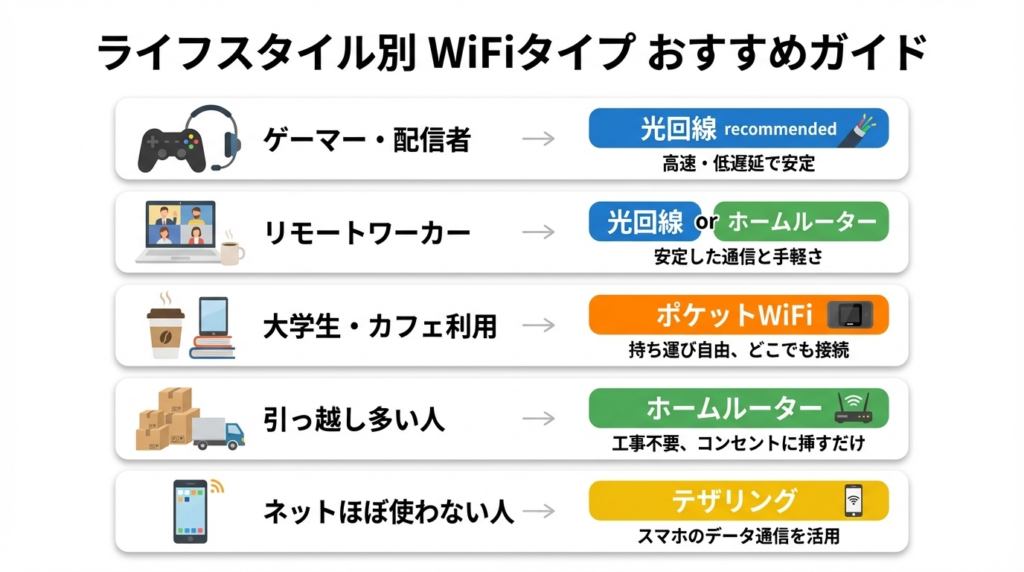 一人暮らしのWi-Fi選びで最も大切なのは、「自分の使い方に合ったタイプを選ぶ」こと。料金だけで飛びつくと速度不足で後悔し、スペックだけで選ぶとオーバースペックで無駄な出費になります。