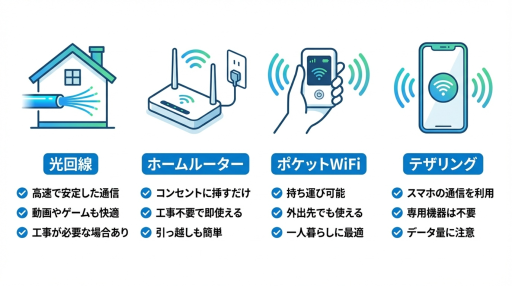 選択肢は大きく光回線・ホームルーター・ポケット型WiFi・テザリングの4つ。それぞれ料金も速度も開通までの手間もまったく違うので、「とりあえず安いやつ」で選ぶと後悔しがちです。