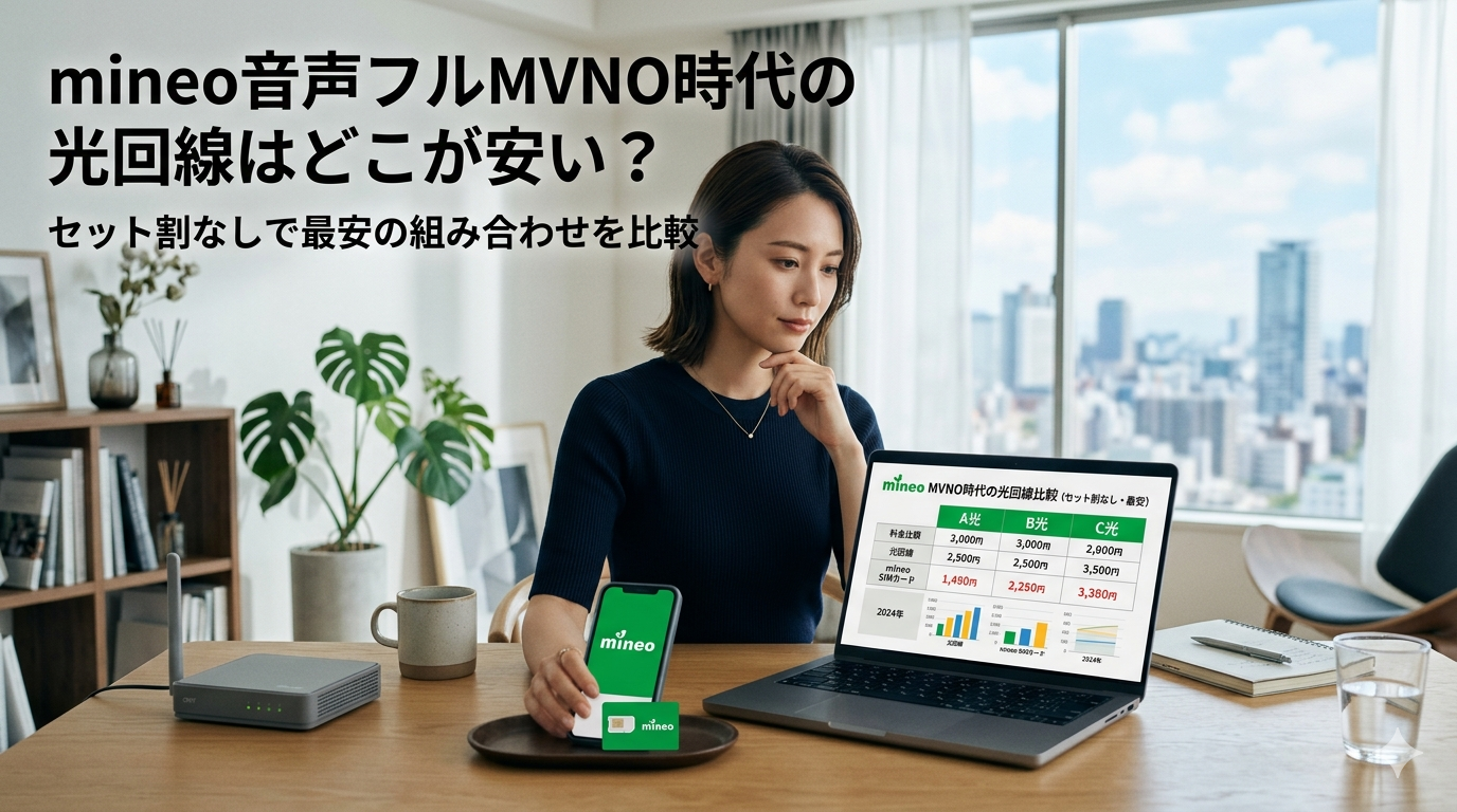 この記事では、mineoユーザーが光回線を選ぶときの判断軸を整理したうえで、セット割なしで月額料金が安い光回線3社を比較し、トータルコストの具体的なシミュレーションまで提示します。「どの光回線と組み合わせれば毎月の通信費がいちばん抑えられるのか」を、この記事だけで判断できる内容にまとめました。
