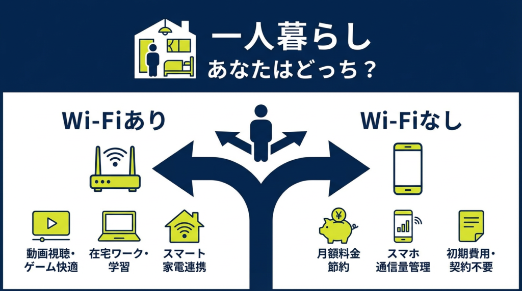 一人暮らしでWi-Fiは本当に必要なのか 「一人暮らしを始めるけど、Wi-Fiって本当に必要?」「固定費を抑えたいから、Wi-Fi契約しなくても大丈夫かな」と悩んでいる方は多いのではないでしょうか。 結論から言うと、一人暮らしでWi-Fiがいらないかどうかは... -