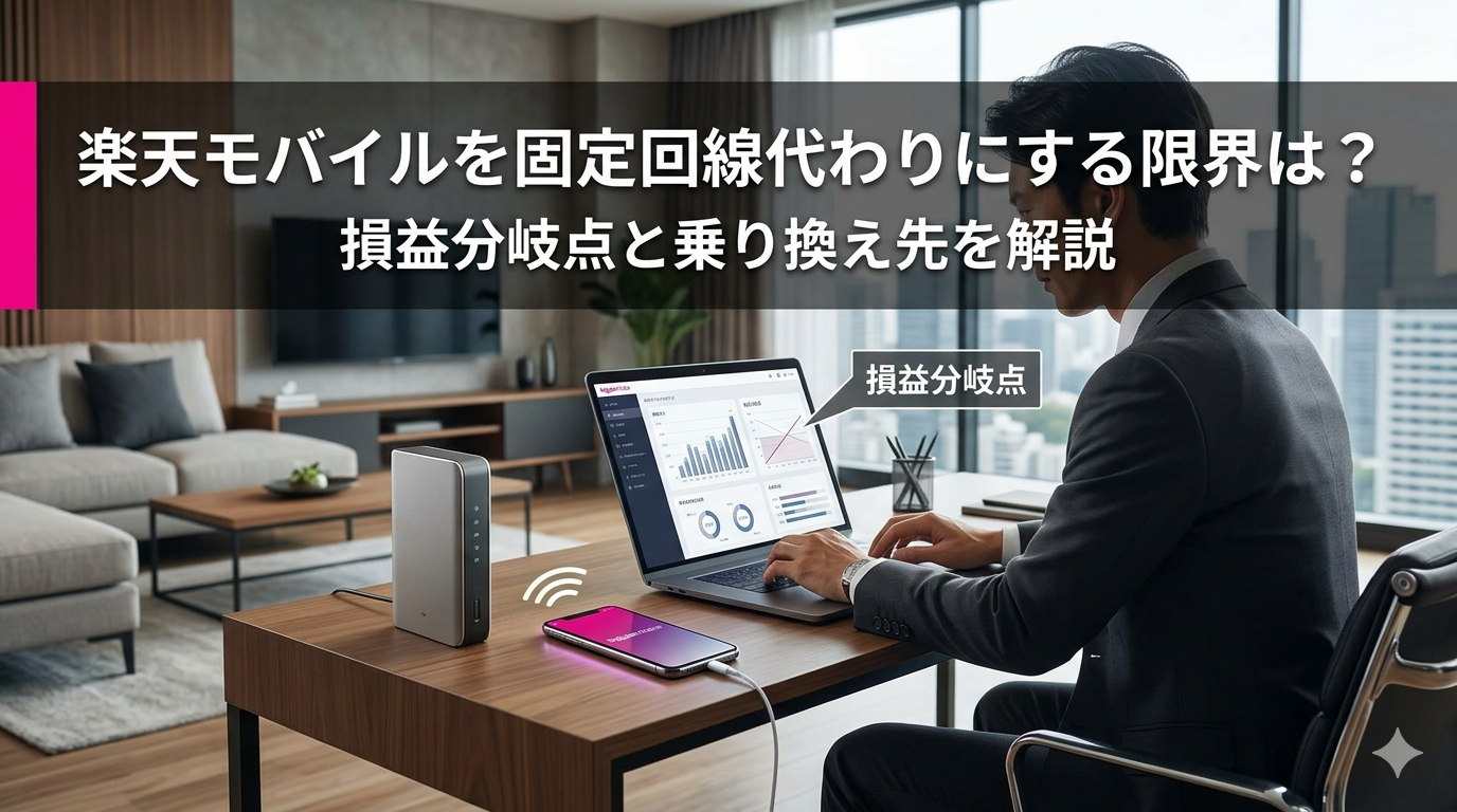 この記事では、楽天モバイルを固定回線代わりに使える「限界値」を通信量・家族構成・用途別のマトリクスで明示し、超えた場合の乗り換え先としてGMO光アクセスやGMOとくとくBBホームWi-Fiなど具体的な移行先まで提示します。既存の楽天モバイルを固定回線代わりにする方法の入門記事とあわせて読むと、判断材料がそろいます。