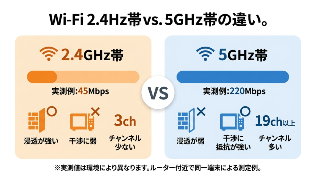 Wi-Fiルーターには2.4GHz帯と5GHz帯(一部の新しいルーターは6GHz帯も)があります。多くの端末は初期設定で2.4GHz帯に接続することが多いですが、2.4GHz帯は理論上の最大速度が5GHz帯より遅く、干渉も受けやすいです。